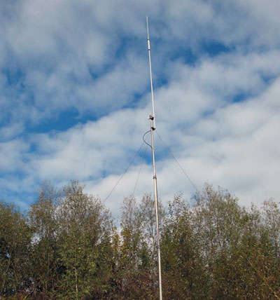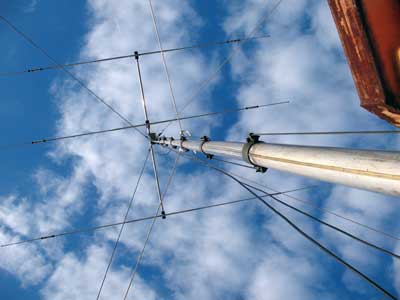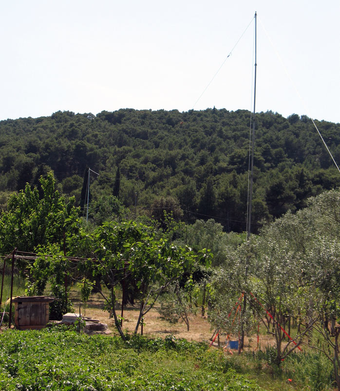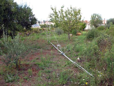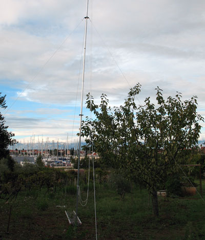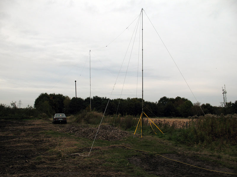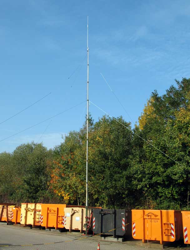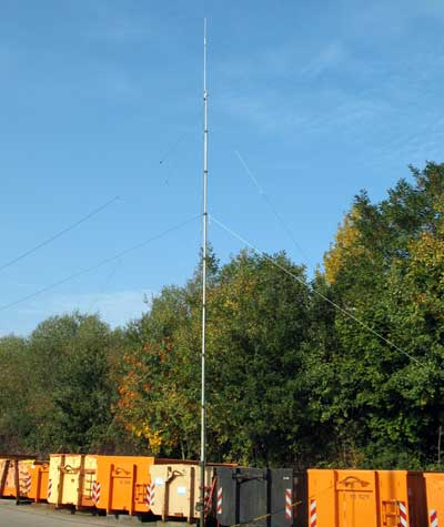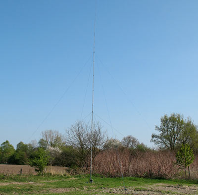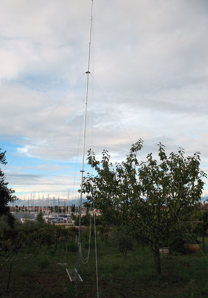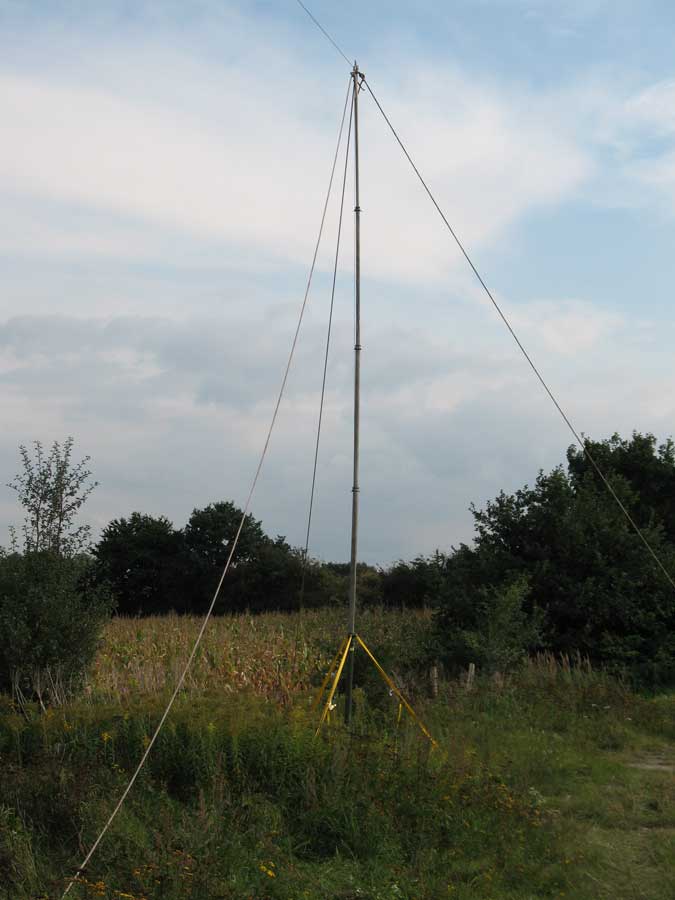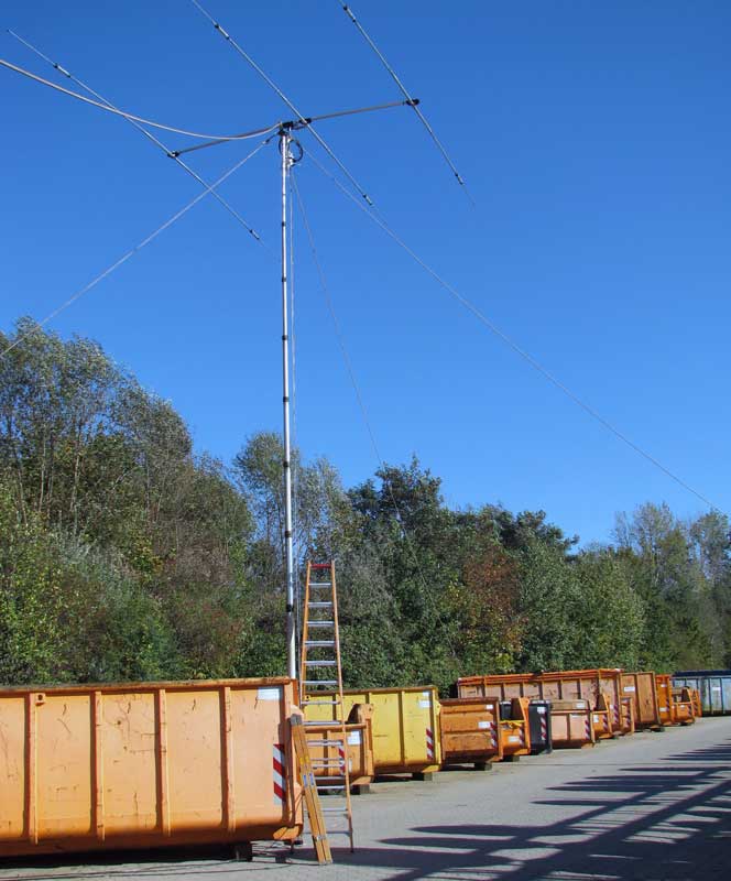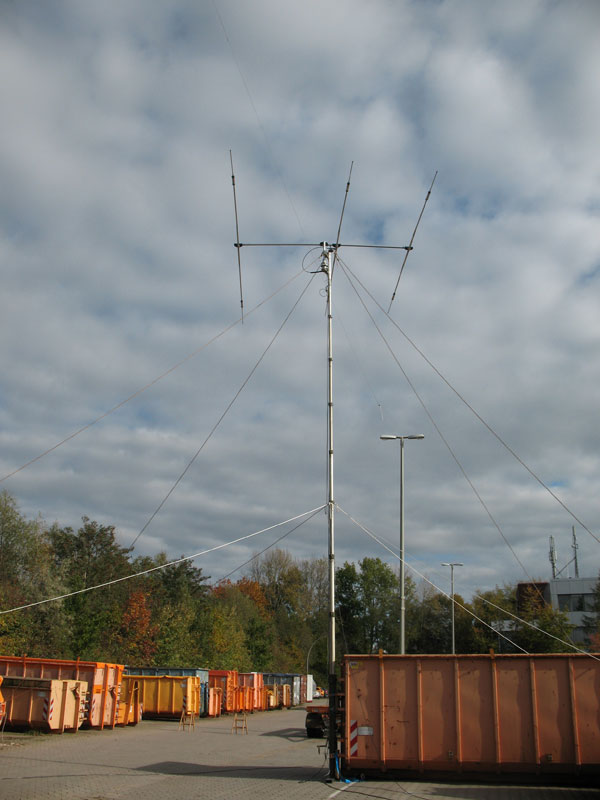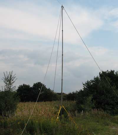 |   | Der Mast fertig aufgestellt und abgespannt, zum Schluss mit dem 20/40m Doppel-Dipol.