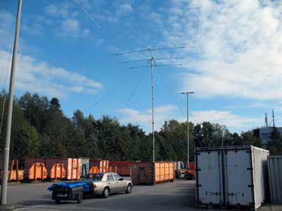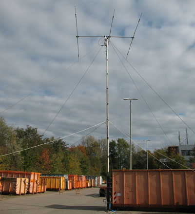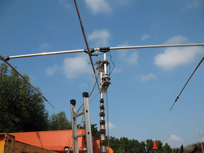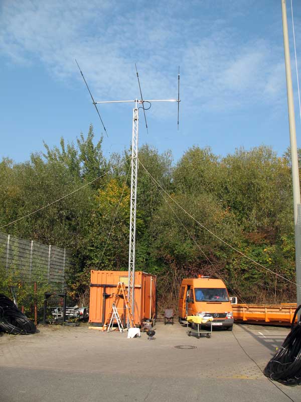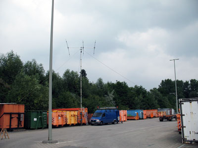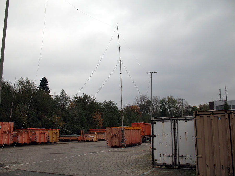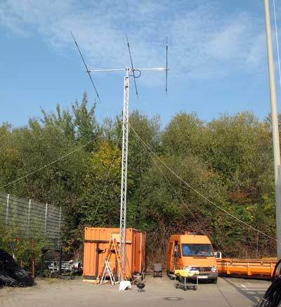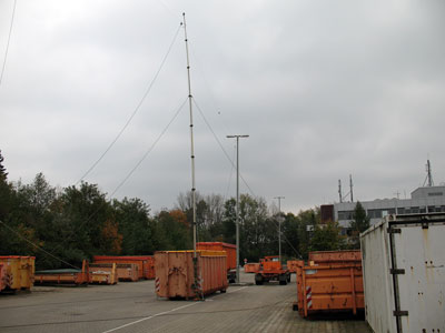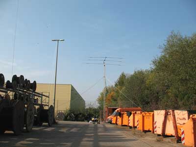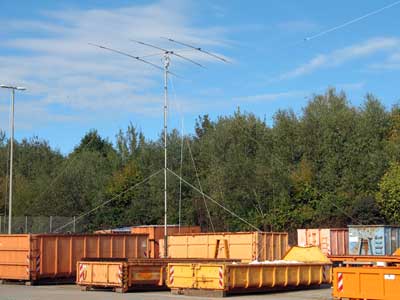 |   | Der Beam nun auf dem 11m Gittermast direkt am Shack-Container befestigt. Links oben am Lichtmast jeweils die Enden der 40m und 80m Dipole, ca. 12m hoch