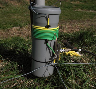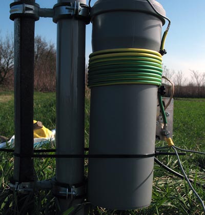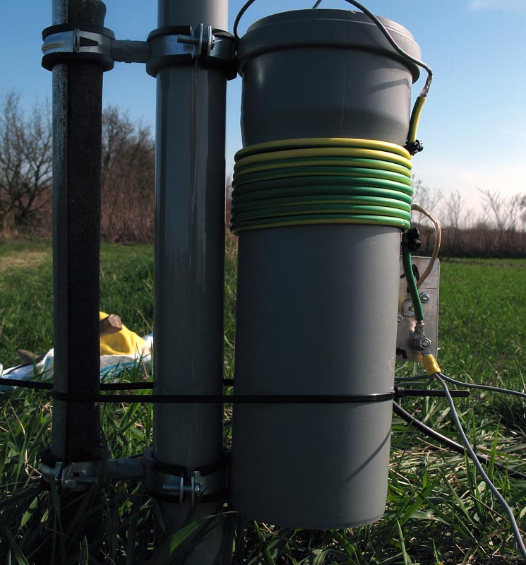|   | Ansicht Erdspieß, GFK-Mast und Spule gewickelt auf einem Abflussrohr (wird noch hübscher gemacht). |