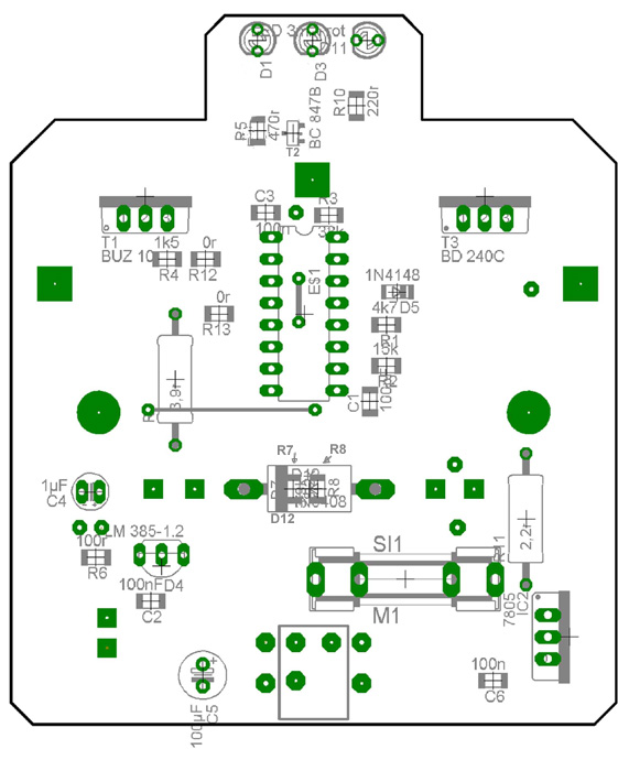 Bauteilliste: Zubeachten ist, welche Bauteile SMD sind und welche nicht ! Teil Wert C1 100pF C2 100nF C3 100nF C4 1µF C5 100µF C6 100n D1 LED 3mm rot D2 none D3 LED 3mm rot D4 LM 385-1.2 D5 1N4148 D6-D10 none D11 LED 3mm rot D12 1N5408 IC1 ICS1700A IC2 7805 R1 4k7 R2 15k R3 33k R4 1k5 R5 470r R6 100r R7* 8,2k R8* 3,9k R9 3,9r R10 220r R11 2,2r R12 0r R13 0r SI1 Halter-Hälften T1 BUZ 10 T2 BC 847B T3 BD 240C außerdem: 1x Taster schließer (bei Bedarf, siehe Text) 2x Glimmerscheiben TO-220 2x Isolierbuchsen TO-220 etwas Wärmeleitpaste 4x Drahtbrücken 1x Sicherung 1A Mittelträge Es werden folgende Bauteile von der alten Platine benötigt: - Kühlwinkel - Buchse Netzteil - Buchse für Ladeschacht - Kontaktfedern*) Die Widerstände R7 und R8 werden UNTER der Diode D12 bestückt ! =============================================================== Hier die Bilder (anklicken):