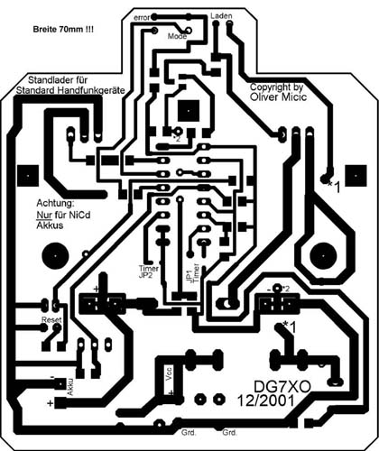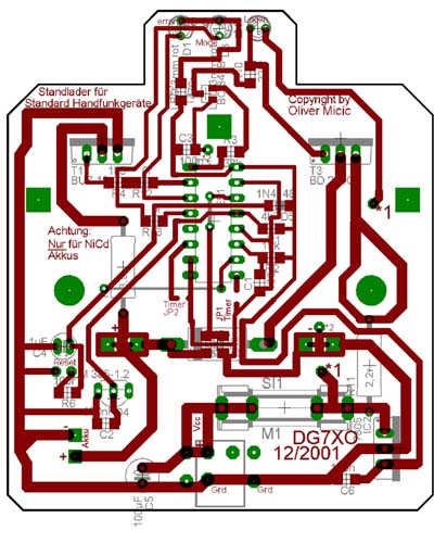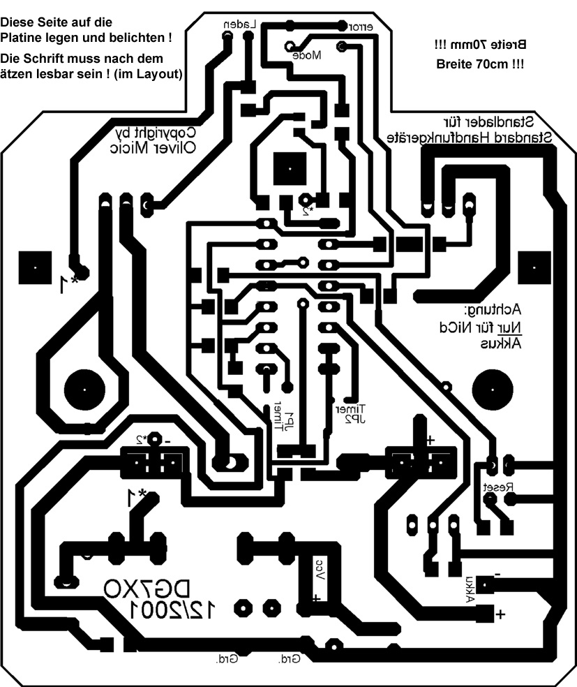 Allgemeine Hinweise: Die Schaltung bassiert auf das Lade-IC ICS-1700A von galaxypower.com . In der A Version ist es laut Hersteller auch möglich, NiMh-Akkus zur Laden, was in der "AltVersion" nicht möglich war. Dies habe ich allerdings noch nicht getestet. Hinweise zum Aufbau: - Es werden folgende Bauteile von der alten Platine benötigt: - Kühlwinkel - Buchse Netzteil - Buchse für Ladeschacht - Kontaktfedern - Alle Bauteile werden von der Layout Seite bestückt ! - Daher ist etwas Luft für die Kondensatoren, IC-Sockel etc zu lassen. - Es sind Bohrung für den Kühlwinkel für die Befestigungslöcher vorzusehen, der Durchmesser sollte die Lötaugengröße nicht überschreiten. - Es sind 2 Lötbrücken mit Draht zu bestücken und 2x 0 Ohm SMD Widerstände. - 2 Drähte sind mit den Punkten *1 und *2 jeweils zu verbinden (nicht *1 mit *2 !!) - Die Diode D12 ist etwa 5-10mm über die Platine zu löten sowie auch R9 und R11. - Der Kühlwinkel DARF die Leiterbahnen NICHT berühren. - Die Netzteilbuchse muss mit einem Stück Draht zusätzlich verstärkt werden. Hierzu die Bohrung daneben verwenden und ein stück Draht an den Pins anlöten und mit der Platine verlöten, dabei auf die Polung achten. - Die Dioden D2 und D6-D12 sind nicht vorhanden. Hinweise zur Schaltung: