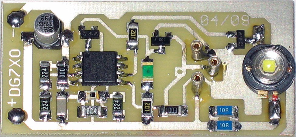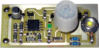 Die Platine besteht aus einem PIR-Modul, dem Controller und einer 1W-Luxeon LED.
