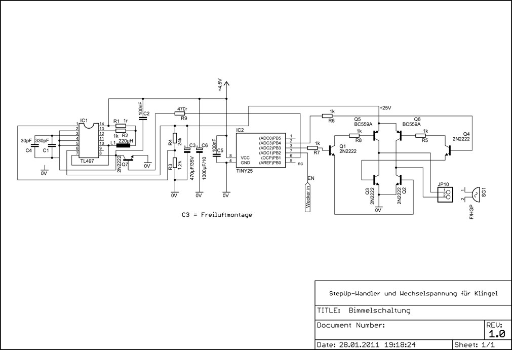 Die typische Klingeltonerzeugung wird von einem ATTiny25 gesteuert, der die +25V Schaltung aktiviert