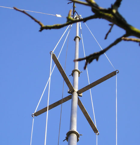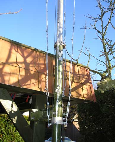 für die andere Seite musste ein Baum hinterm Haus herhalten. Mangels Platz zum Abspannen, habe ich eine 4-fach Saling gebaut. Die Seile und